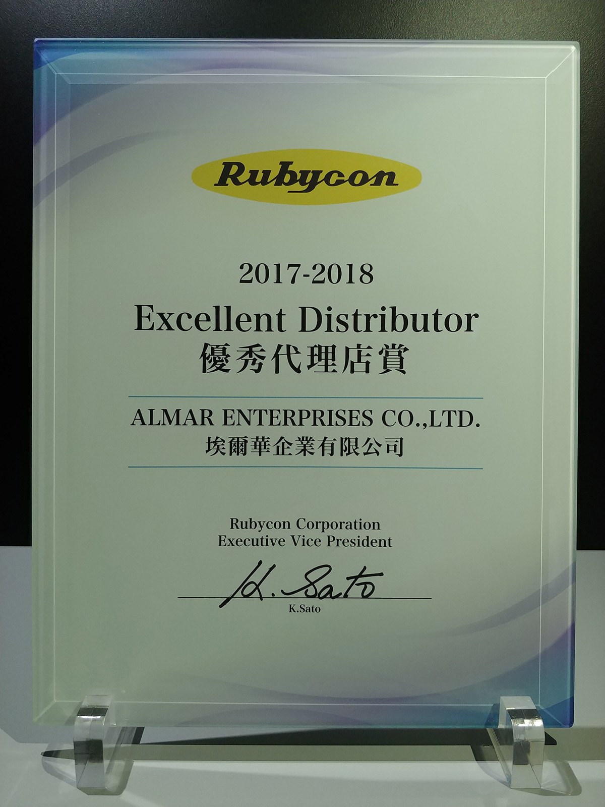 榮獲Rubycon(紅寶石電容)頒授“優秀代理店”